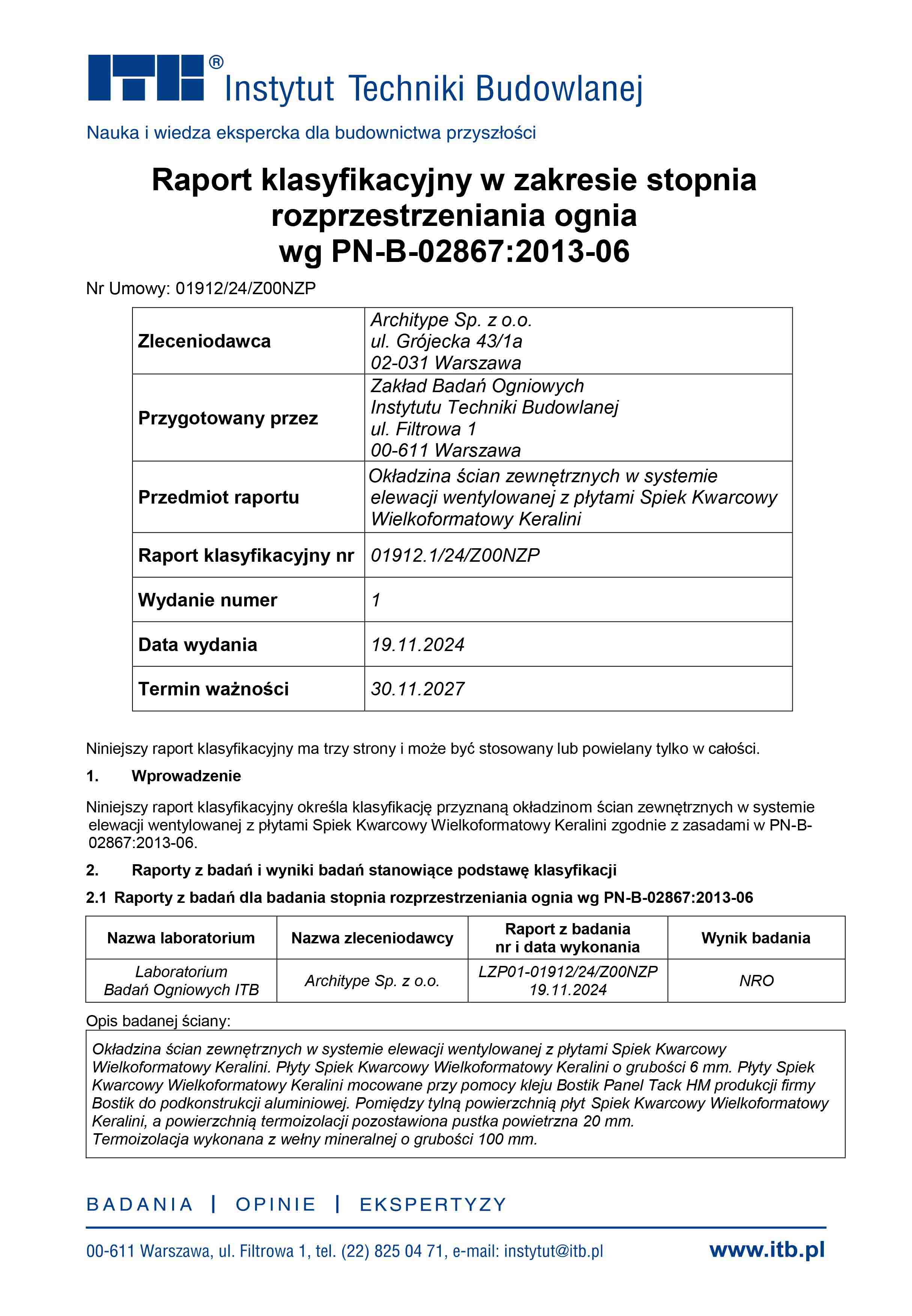 Niniejszy raport klasyfikacyjny określa klasyfikację przyznaną okładzinom ścian zewnętrznych w systemie elewacji wentylowanej z płytami Spiek Kwarcowy Wielkoformatowy Keralini zgodnie z zasadami w PN-B-02867:2013-06.